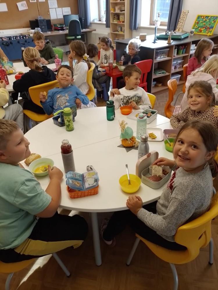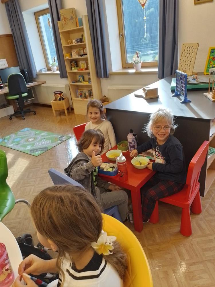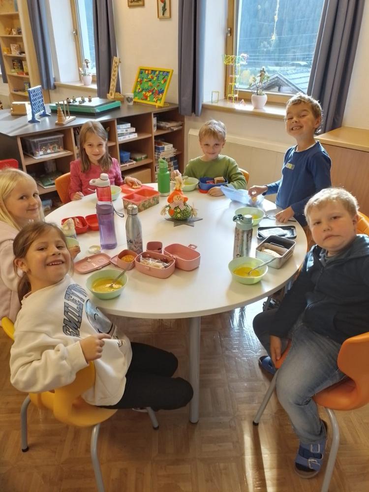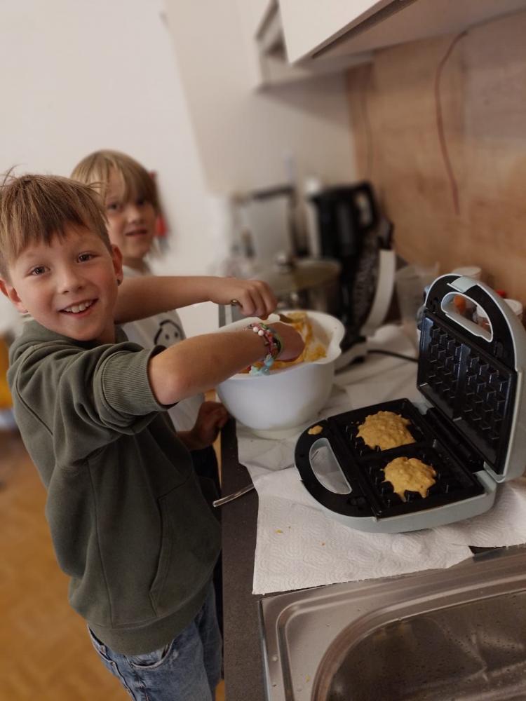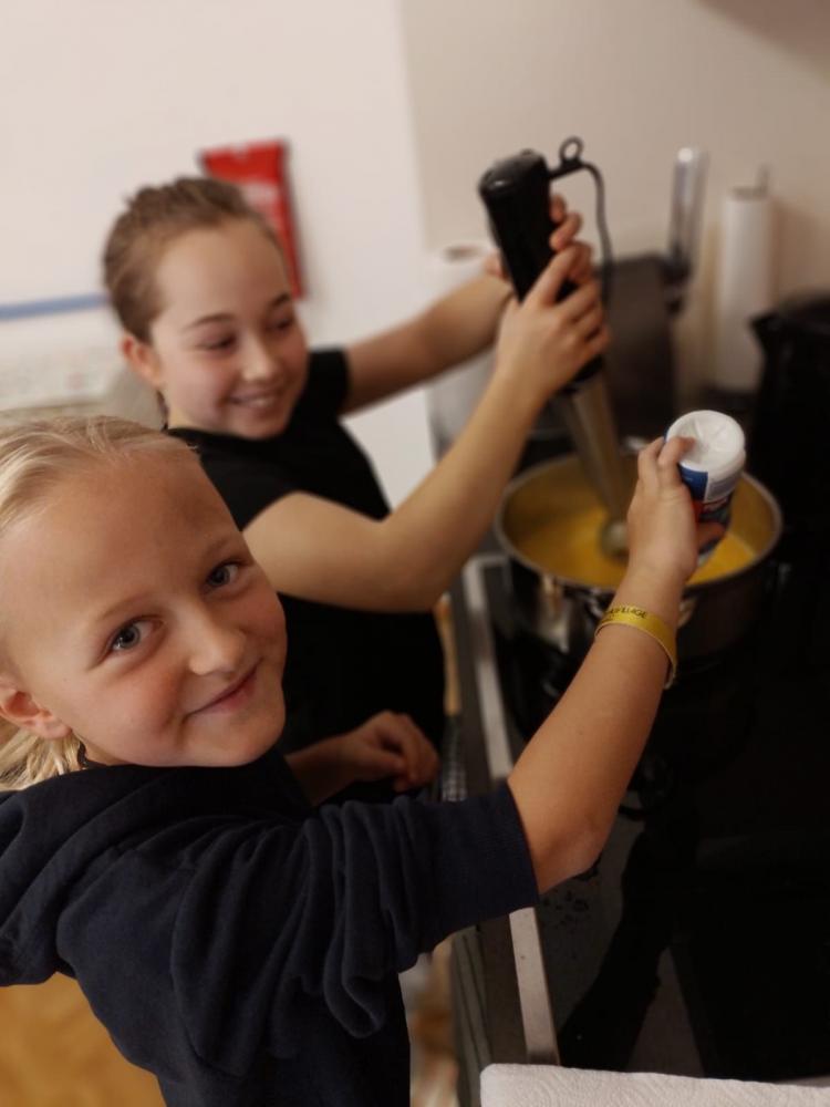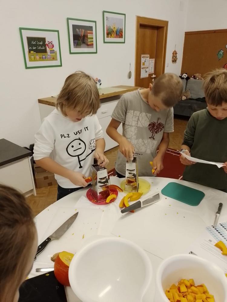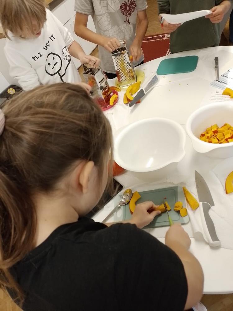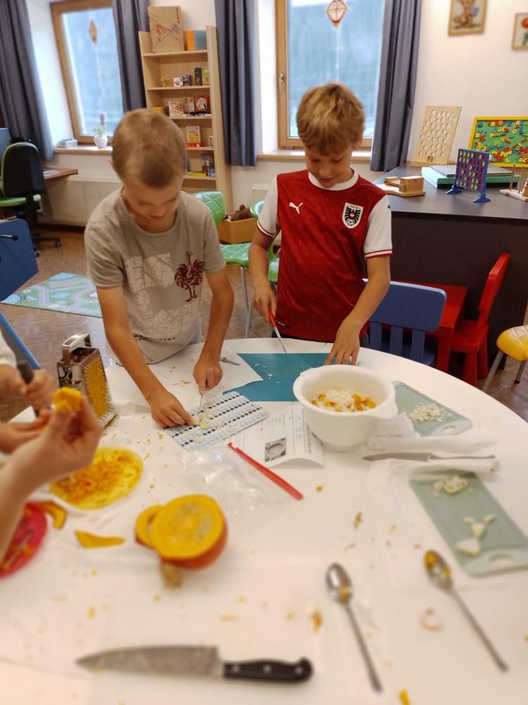 Am Freitag, den 10.10., haben wir mit der vierten Klasse gekocht. Auf dem Speiseplan standen Kürbissuppe und Kürbiswaffeln. Die Kinder waren mit großer Begeisterung dabei und lernten dabei wichtige Dinge des täglichen Lebens: wiegen, messen, schneiden, schälen, raspeln und vieles mehr. Das gemeinsame Kochen förderte nicht nur die praktische Erfahrung, sondern auch Teamarbeit und Freude am gesunden Essen. In der Pause konnten alle Kinder der ersten Klasse Klasse die Speisen probieren.